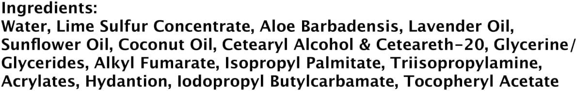 Ingredients ; Water, Lime Sulfur Concentrate, Aloe Barbadensis, Lavender Oil, Sunflower Oil, Coconut Oil, Cetearyl Alcohol & Ceteareth-20, Glycerine/Glycerides, Alkyl Fumarate, Isopropyl Palmitate, Triisopropylamine, Acrylates, Hydantion, Iodopropyl Butylcarbamate, Tocopheryl Acetate