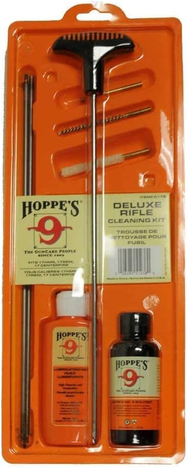Hoppe's No. 9 cleaning kit with 3-piece steel rod is the perfect kit for 17 HMR, .17/.204 caliber rifle enthusiasts. With one 4 oz. bottle of cleaning solvent and one 2-1/4 oz. bottle of lubricating oil included, this kit has everything you need to maintain your rifle. Plus, the included brush specifically designed for the intended caliber makes cleaning a breeze. Upgrade your rifle maintenance game with this high-quality cleaning kit!