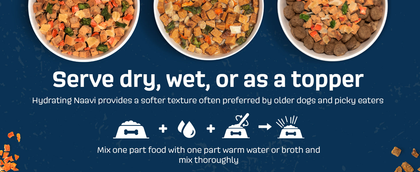 • A CATEGORY OF ITS OWN: Naavi is a nutritionally balanced food for adult dogs that satisfies even the pickiest eaters. You can serve it on its own as dry food, mixed with broth or water as wet dog food, an enticing dog food mix in or topper, or a standalone treat. You can safely rotate between recipes and the variety of textures, flavors, and aromas make it unlike any other pet food