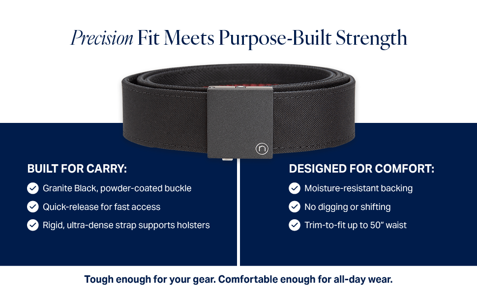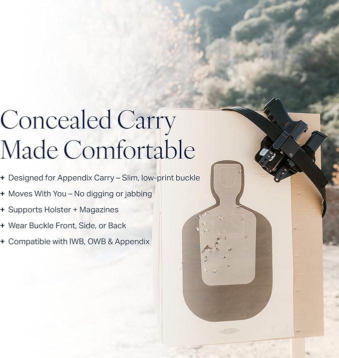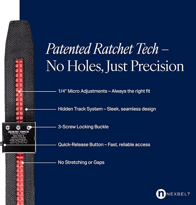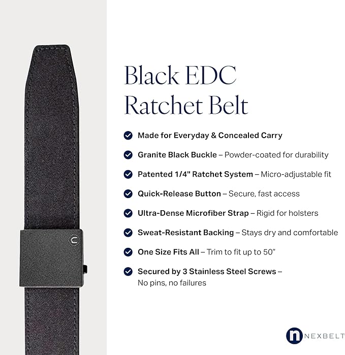 The Nexbelt EDC Tactical Ratchet Belt is designed for concealed carry, offering a precise fit through its ratcheting system with quarter-inch adjustments. Its durable build keeps the belt firm without sagging, ensuring secure firearm retention and compatibility with both OWB and IWB holsters. Users highlight its comfort, even after wearing it for 12 hours straight. While the belt is dependable and sturdy, be sure it meets your specific needs before purchasing.