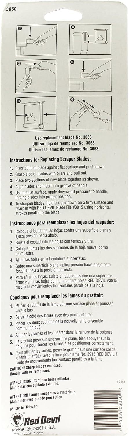Steel blade with heavy-duty plastic handle. Use to remove paint or varnish from furniture, molding, cornices, wooden sashes, etc.
