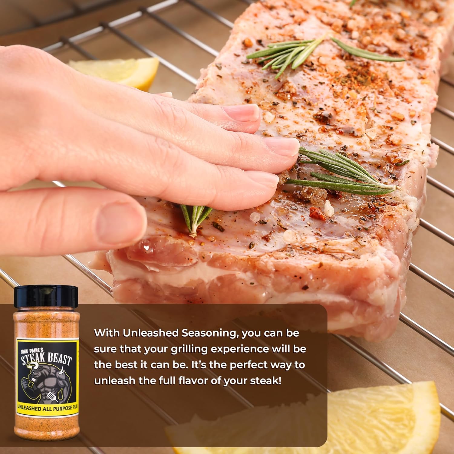 Introducing Steak Seasoning, crafted by an award-winning grill master, gives you succulent, flavorful steaks. With a perfect blend of savory and sweet, it elevates your grilling game effortlessly. For chicken, Beast Bird Chicken Seasoning offers a deliciously sweet and spicy kick, while Chop Beast enhances all pork cuts with a smooth hickory accent. Unleashed Seasoning adds a buttery twist to any meat or vegetable, ensuring a top-tier grilling experience every time!