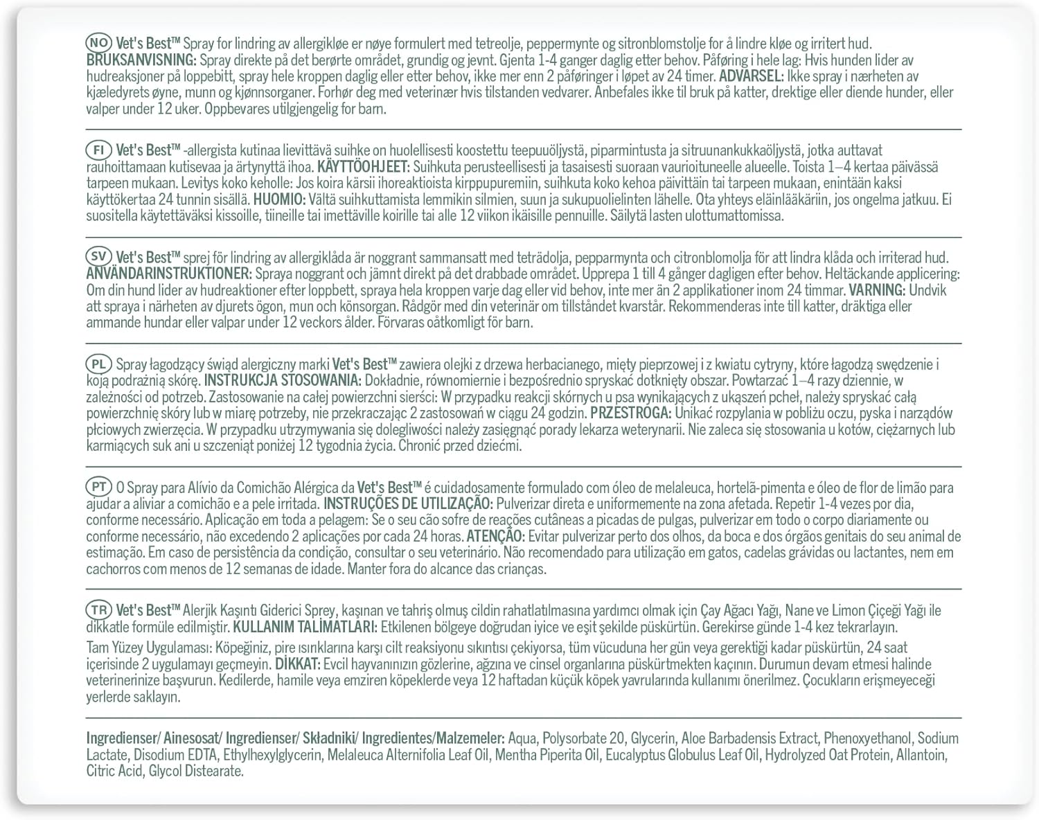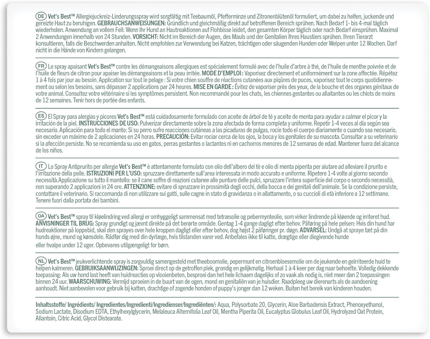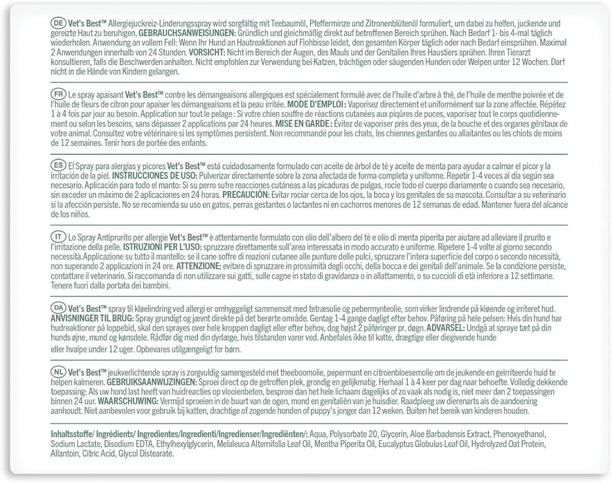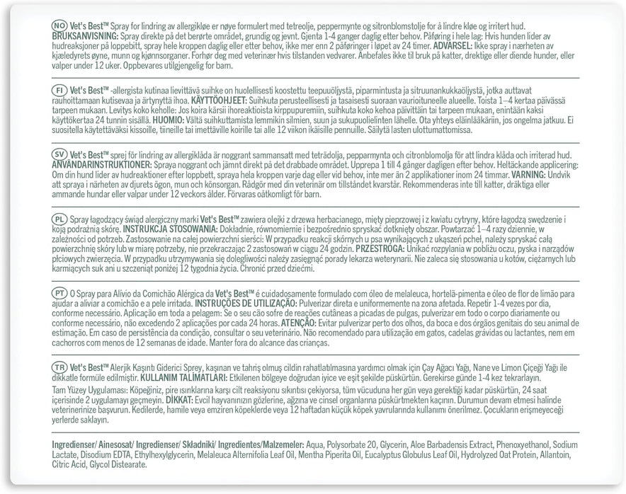 Provide your dog immediate relief to itchy, irritated skin with Vet's Best Allergy Itch Relief Dog Spray. Our soothing, veterinarian-formulated blend of natural ingredients (including oatmeal, tea tree oil, neem oil, aloe vera, and chamomile) work together to comfort and protect your pet from seasonal allergies related to pollen, flea bites, and other seasonal irritants. Formula is alcohol-free and non-stinging.